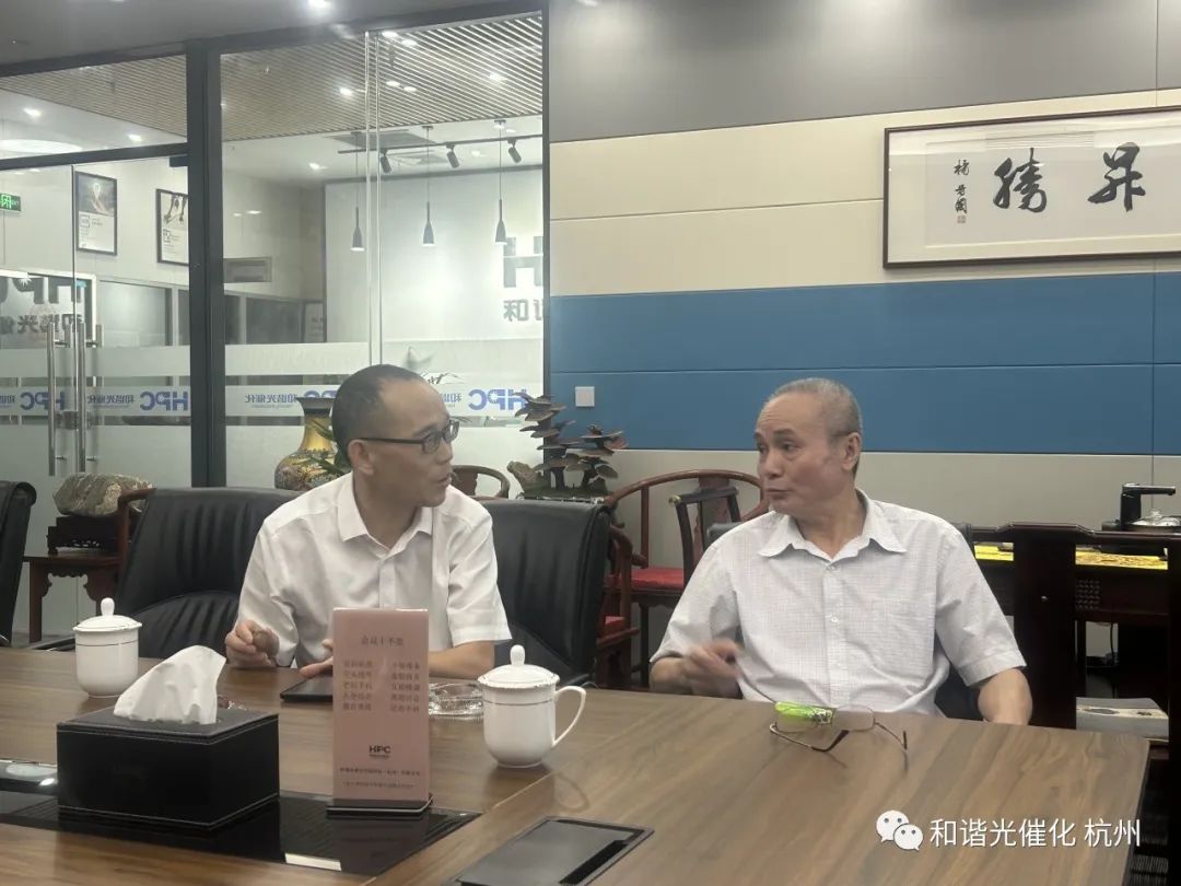 2023年8月22日福州大学国家环境光催化工程技术研究中心戴文新主任一行莅临公司考察调研,HPC和谐光催化公司董事长陈纳新、总经理陈一锋率全体员工热情接待并引导参观。